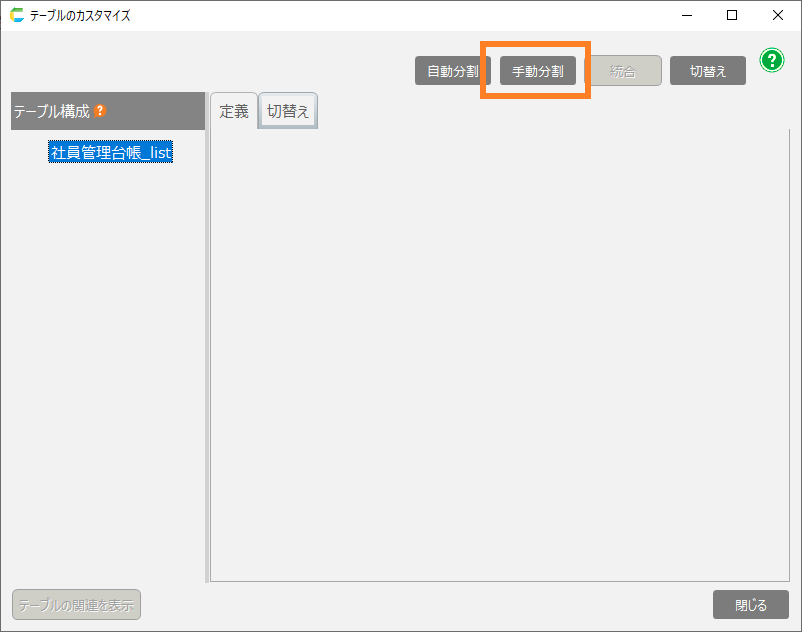 - テーブルのカスタマイズ画面中央にあるボタン「手動分割」をクリックします。