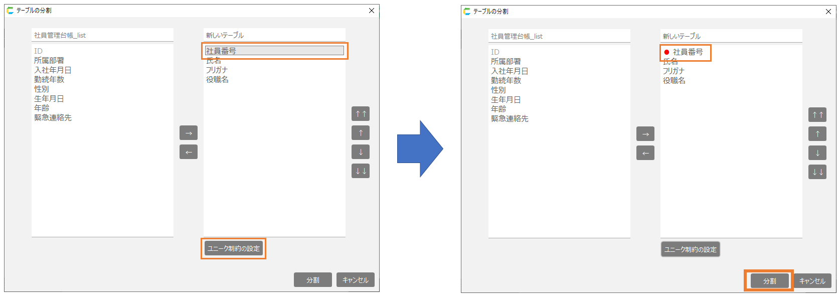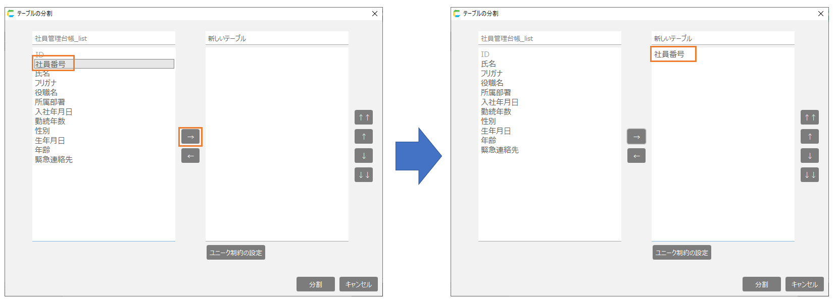 - 分割元テーブルの項目の中から分割先テーブルに移動したい項目を選択肢「→」をクリックします。