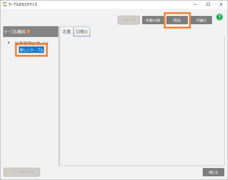 - 分割したテーブルを元に戻したい場合は戻したいテーブルを選択して「統合」をクリックします。