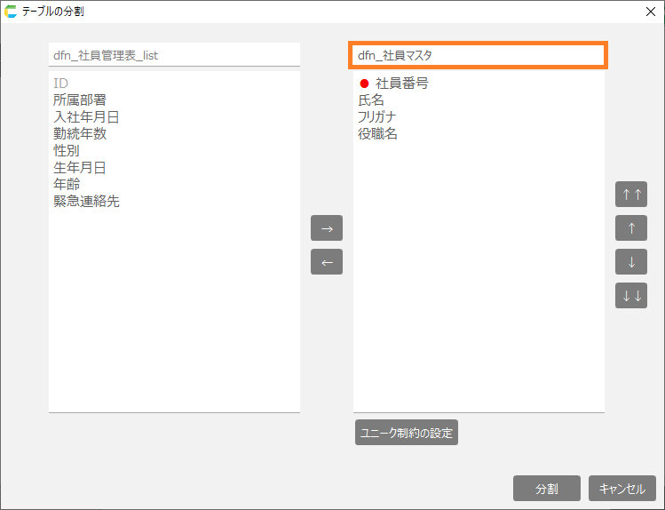 この設定で、ユニーク制約項目とその他の項目を紐づけることができます。設定すると項目名の頭に「●」が付きます。設定後、「分割」をクリックします。