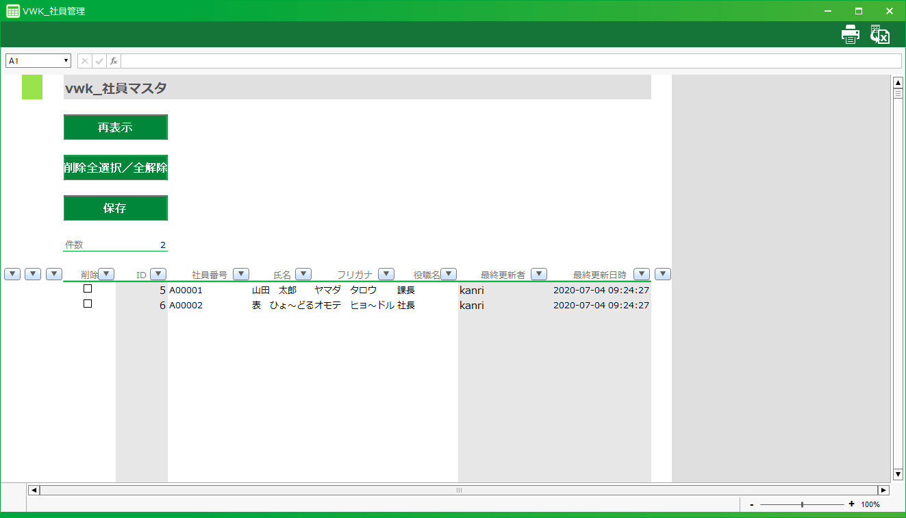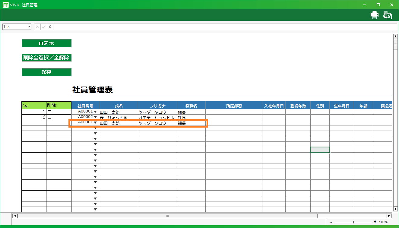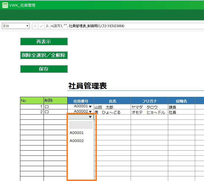 ここでは「社員番号」をユニーク制約項目にしているので、「社員番号」を選ぶと自動で「氏名」「カナ」「役職名」が取得されます。