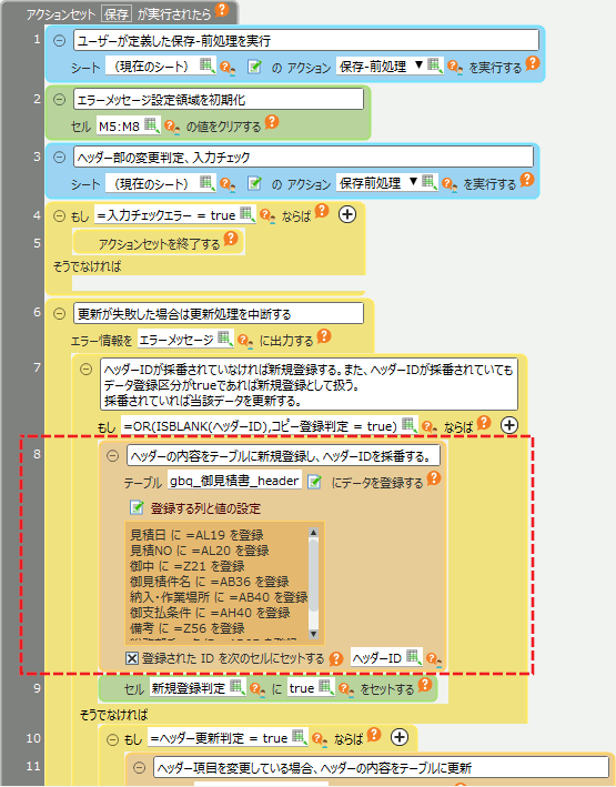 - 「アクションセット設定」ダイアログが開いたら、ヘッダーの内容をテーブルに新規登録しているアクションを見つけます。
