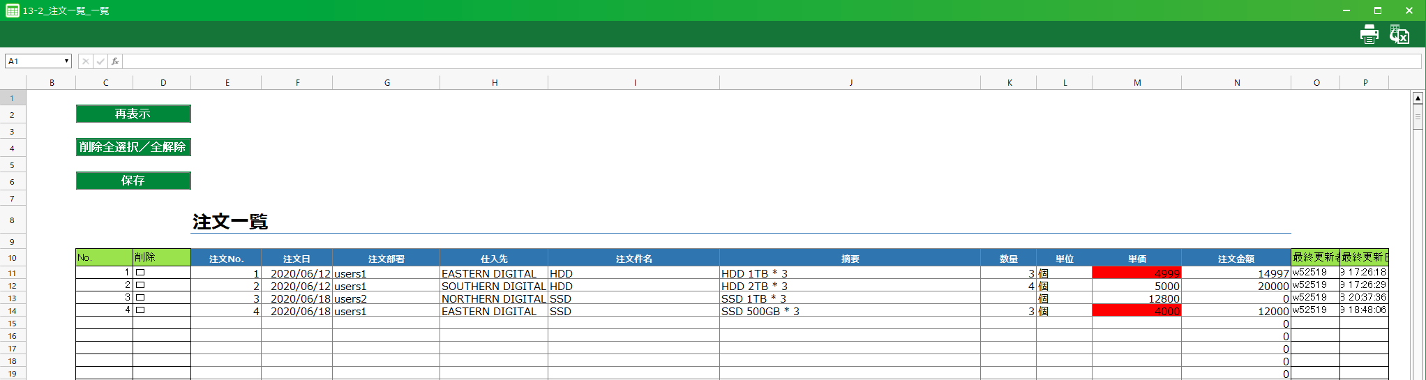- 「注文一覧_制御用(アクション)」シートをダブルクリックします。