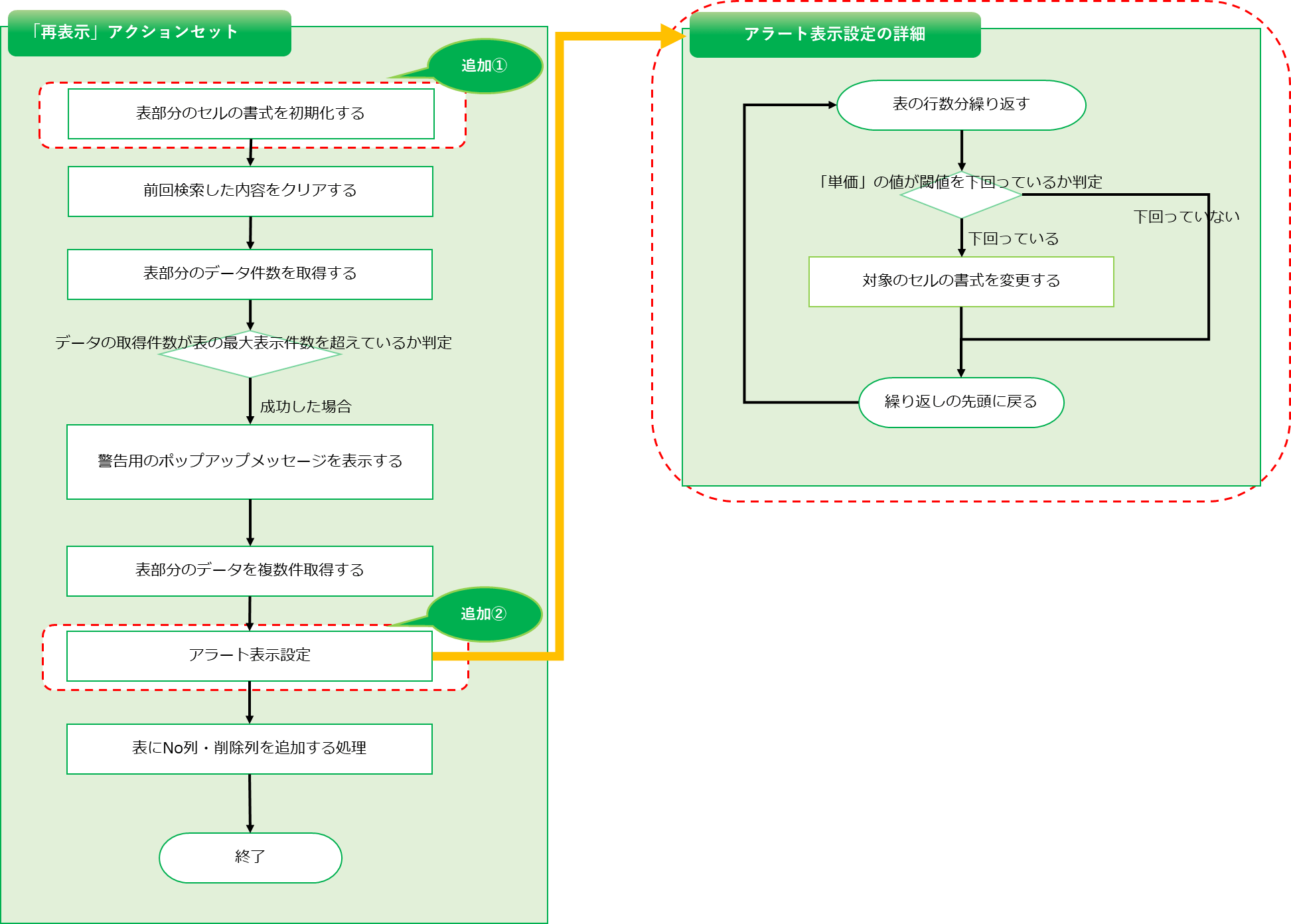 「再表示」アクションにアラート表示機能を追加した際の処理フローが下の図となります。