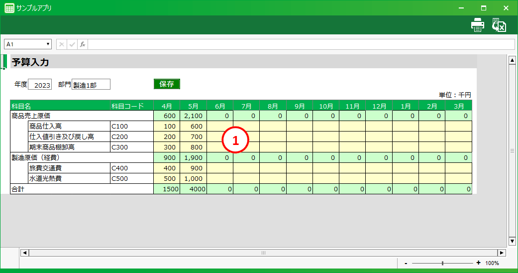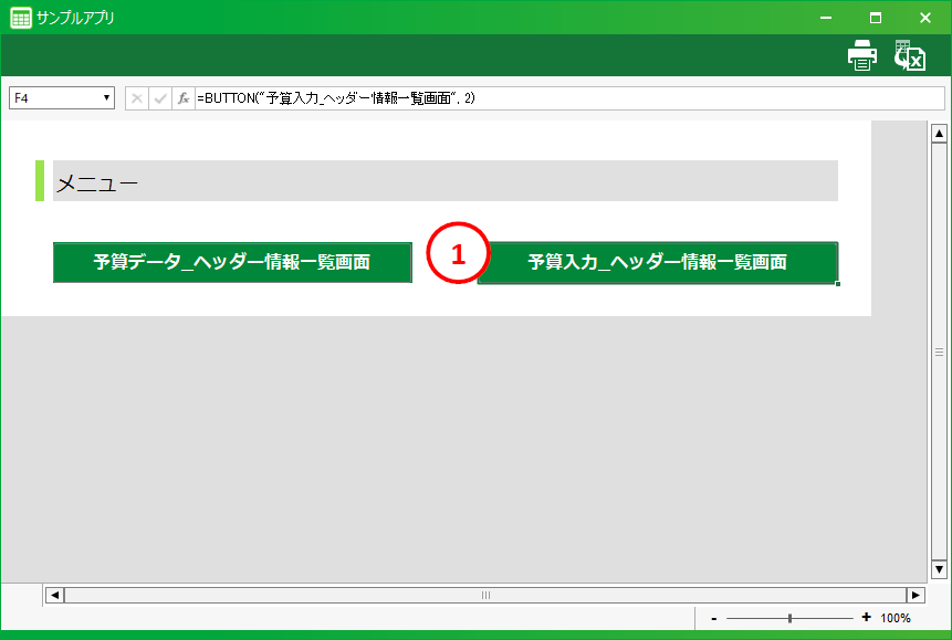 [1] データ入力領域アプリ作成のときに設定したデータ入力セルです。データの表示およびデータを入力する領域になります。アクションセット