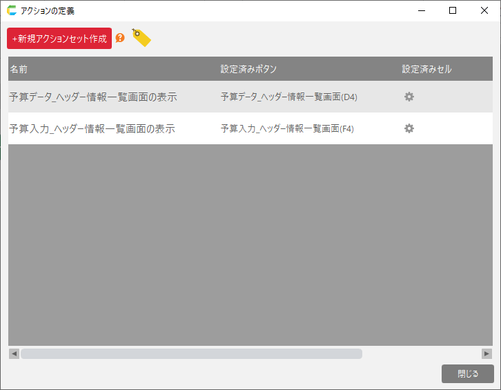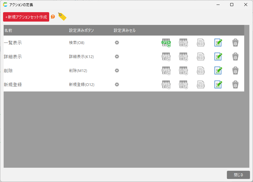 シートの内容は一覧表アプリの制御用シート(リスト)と同様です。画面項目、アクションセットの内容は 制御用シート(リスト) を参照してください。