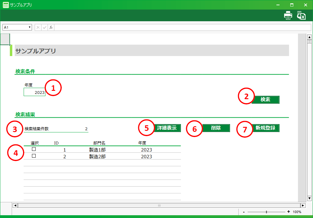 [1] 検索ボックス検索条件を入力するための領域です。[2] 検索ボタンデータベースからデータを検索し、検索結果を表示するボタンです。[3] 検索結果件数一覧に表示している件数です。[4] データ一覧データベースから取得したデータを表示する領域です。[5] 詳細表示ボタンメイン画面を表示し、選択したデータの詳細を表示するボタンです。[6] 削除ボタン選択したデータをデータベースから削除するボタンです。[7] 新規登録ボタンデータ未入力のメイン画面を表示し、新規にデータの登録を行うボタンです。アクションセット
