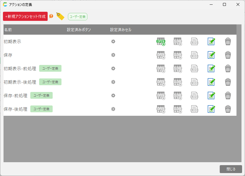 アクションセット名 説明 初期表示-前処理 「初期表示」のアクションセットが実行される前に呼び出されるアクションセットです。 初期表示-後処理 「初期表示」のアクションセットが実行された後に呼び出されるアクションセットです。 保存-前処理 「保存」のアクションセットが実行される前に呼び出されるアクションセットです。 保存-後処理 「保存」のアクションセットが実行された後に呼び出されるアクションセットです。 ちなみに