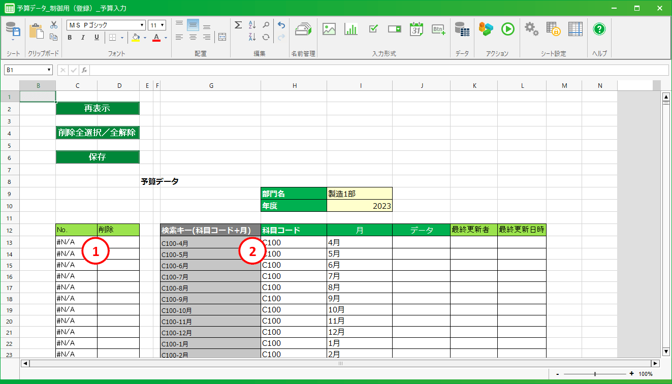 [1] レコードID取得領域参照シートに表示されたレコードIDを参照するセル領域です。アプリ画面を初期表示した際にこの領域にテーブルデータのレコードIDが表示されます。[2] アプリ画面のデータ取得領域アプリ画面のデータ領域を参照するセル領域です。アプリ画面から保存を実行した際にこの領域のデータをテーブルに登録・更新します。アクションセット
