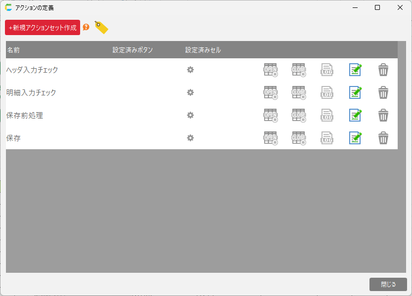 [1] 保存データベースに編集結果を反映するためのアクションセットです。[2] 保存前処理編集前と編集後のデータを比較し、各行について追加・更新・削除するか判定するアクションセットです。このアクションセットは「保存」のアクションセットから呼び出されます。[3] ヘッダ入力チェックヘッダ入力領域の入力チェックするアクションセットです。このアクションセットは「保存」のアクションセットから呼び出されます。[4] 明細入力チェック明細入力領域(表部分)の入力チェックするアクションセットです。このアクションセットは「保存」のアクションセットから呼び出されます。