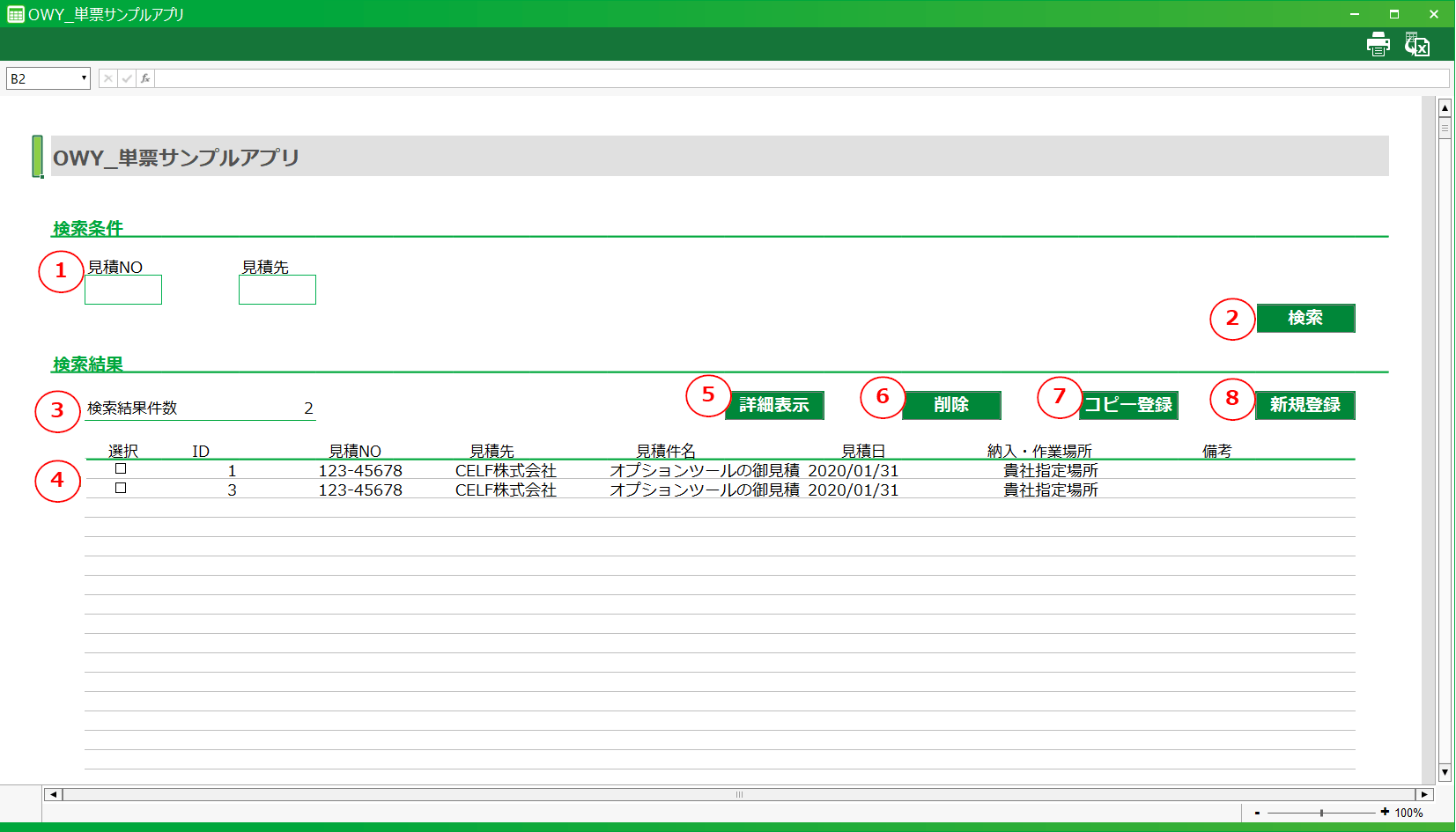 [1] 検索ボックス検索条件を入力するための領域です。[2] 検索ボタンデータベースからデータを検索し、検索結果を表示するボタンです。[3] 検索結果件数一覧に表示している件数です。[4] データ一覧データベースから取得したデータを表示する領域です。[5] 詳細表示ボタンメイン画面を表示し、選択したデータの詳細を表示するボタンです。[6] 削除ボタン選択したデータをデータベースから削除するボタンです。[7] コピー登録ボタン選択したデータを複製し、メイン画面を表示するボタンです。[8] 新規登録ボタンデータ未入力のメイン画面を表示し、新規にデータの登録を行うボタンです。アクションセット