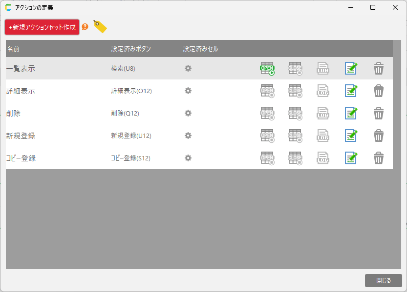 [1] 一覧表示データベースからデータを取得するためのアクションセットです。[2] 詳細表示選択したデータの詳細をメイン画面に表示するためのアクションセットです。[3] 削除選択したデータをデーターベースから削除するためのアクションセットです。[4] 新規登録データ未入力のメイン画面を表示するためのアクションセットです。[5] コピー登録選択したデータを複製しメイン画面を表示するためのアクションセットです。