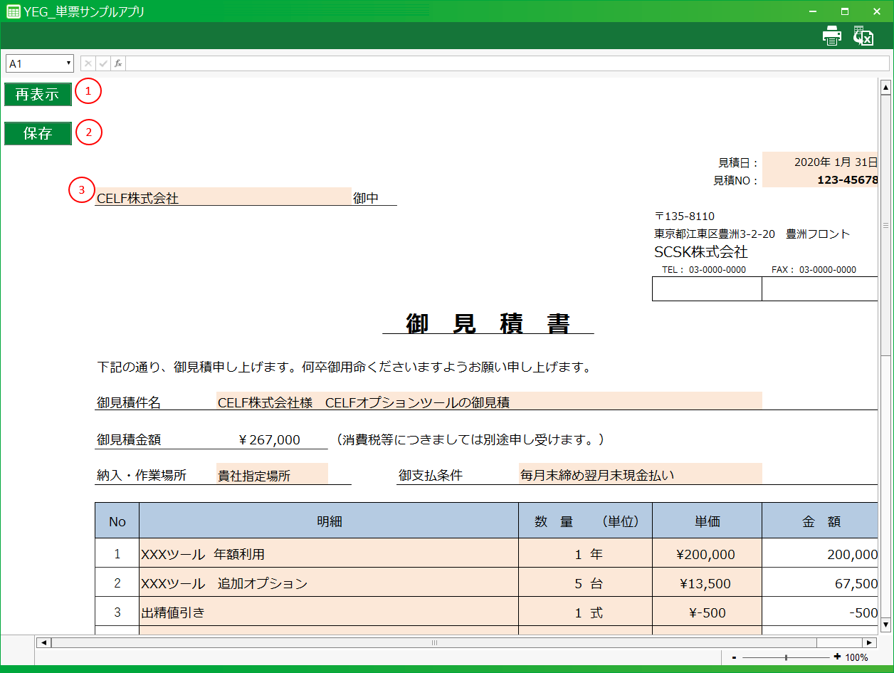 [1] 再表示ボタンデータベースのデータを取得し、画面を更新するためのボタンです。[2] 保存ボタン編集内容を保存するためのボタンです。編集内容がデータベースに反映されます。[3] データ入力領域アプリ作成のときに設定したデータ入力セルです。データの表示およびデータを入力する領域になります。アクションセット