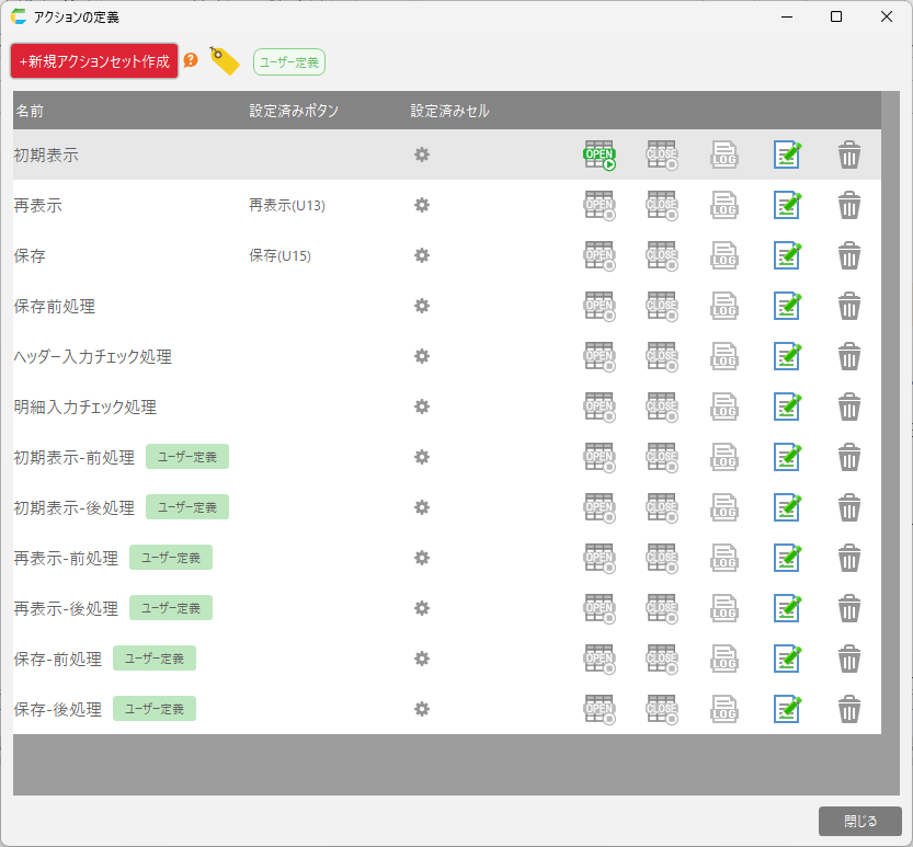 アクションセット名 説明 初期表示-前処理 「初期表示」のアクションセットが実行される前に呼び出されるアクションセットです。 初期表示-後処理 「初期表示」のアクションセットが実行された後に呼び出されるアクションセットです。 再表示-前処理 「再表示」のアクションセットが実行される前に呼び出されるアクションセットです。 再表示-後処理 「再表示」のアクションセットが実行された後に呼び出されるアクションセットです。 保存-前処理 「保存」のアクションセットが実行される前に呼び出されるアクションセットです。 保存-後処理 「保存」のアクションセットが実行された後に呼び出されるアクションセットです。 ちなみに