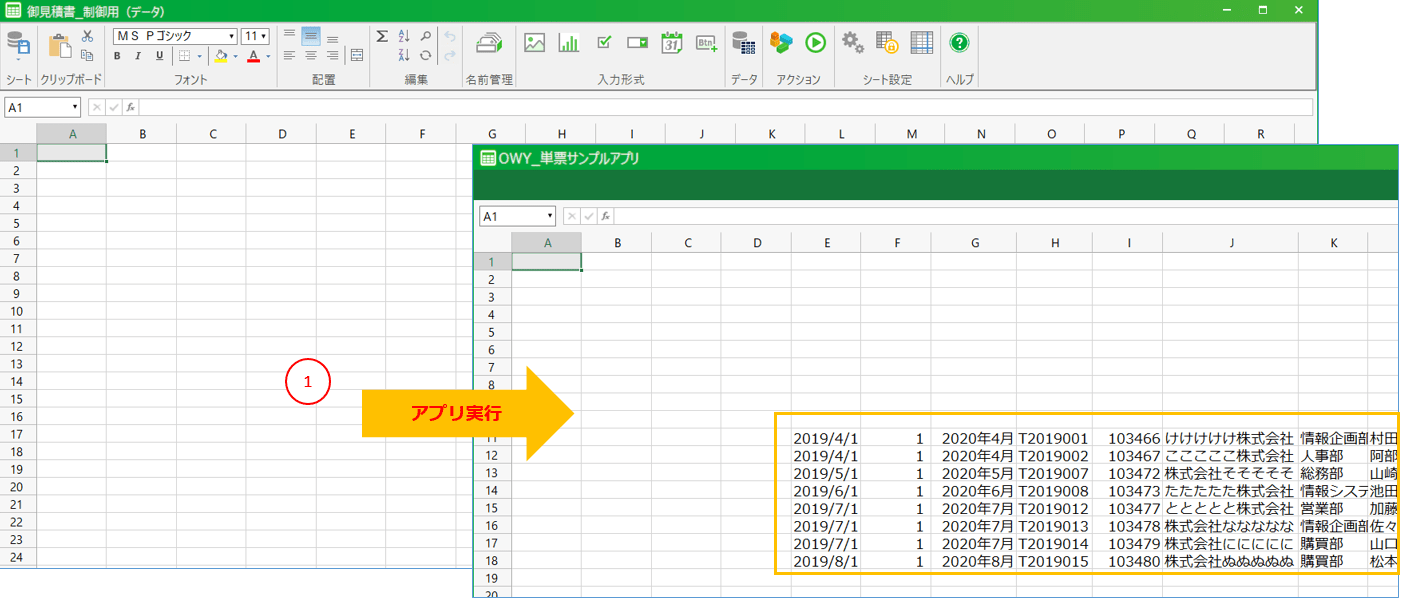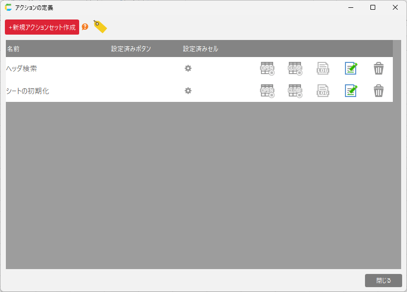 [1] 初期表示画面を開いた際にデータを表示するためのアクションセットです。[2] 再表示データベースからデータを取得し、画面を更新するためのアクションセットです。[3] 保存データベースに編集結果を反映するためのアクションセットです。[4] 保存前処理編集前と編集後のデータを比較し、各行について追加・更新・削除するか判定するアクションセットです。このアクションセットは「保存」のアクションセットから呼び出されます。[5] ヘッダー入力チェック処理ヘッダ入力領域の入力チェックするアクションセットです。このアクションセットは「保存」のアクションセットから呼び出されます。[6] 明細入力チェック処理明細入力領域(表部分)の入力チェックするアクションセットです。このアクションセットは「保存」のアクションセットから呼び出されます。[7] [アクションセット名]-前処理/後処理「Excelからアプリを作成する」機能で作成されたアクションセットが実行される前または実行された後に呼び出される、ユーザーが独自のアクションを定義することができるアクションセットです。単票アプリのメイン画面シートでは、以下のアクションセットが定義されています。