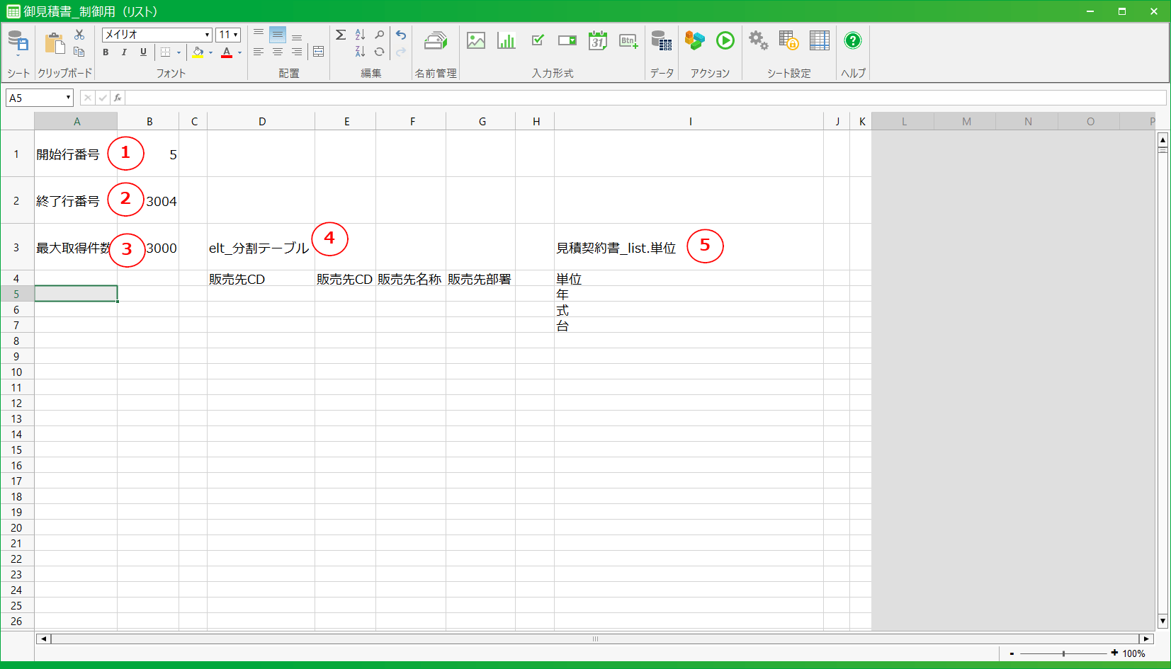 [1] 開始行番号マスタデータの表示開始行を制御する領域です。テーブルカスタマイズで分割したテーブルがある場合に使用されます。[2] 終了行番号マスタデータの表示終了行を制御する領域です。テーブルカスタマイズで分割したテーブルがある場合に使用されます。[3] 最大取得件数マスタデータの最大取得件数を制御する領域です。テーブルカスタマイズで分割したテーブルがある場合に使用されます。[4] マスタデータ表示領域マスタデータを表示する領域です。テーブルカスタマイズで分割したテーブルがある場合に設定されます。分割していない場合、この領域は存在しません。[5] リスト式領域リスト式のデータ領域です。アプリ作成時に入力項目をリスト形式に設定した場合に値が設定されます。リスト形式の設定がない場合、この領域は存在しません。アクションセット