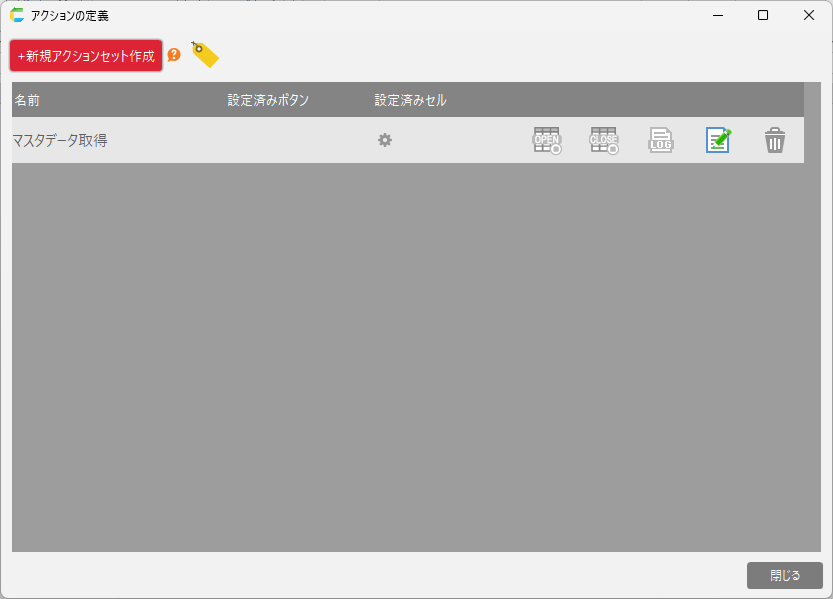 [1] マスタデータ取得マスタデータを取得するアクションセットです。テーブルカスタマイズで分割したテーブルがある場合に使用されます。
