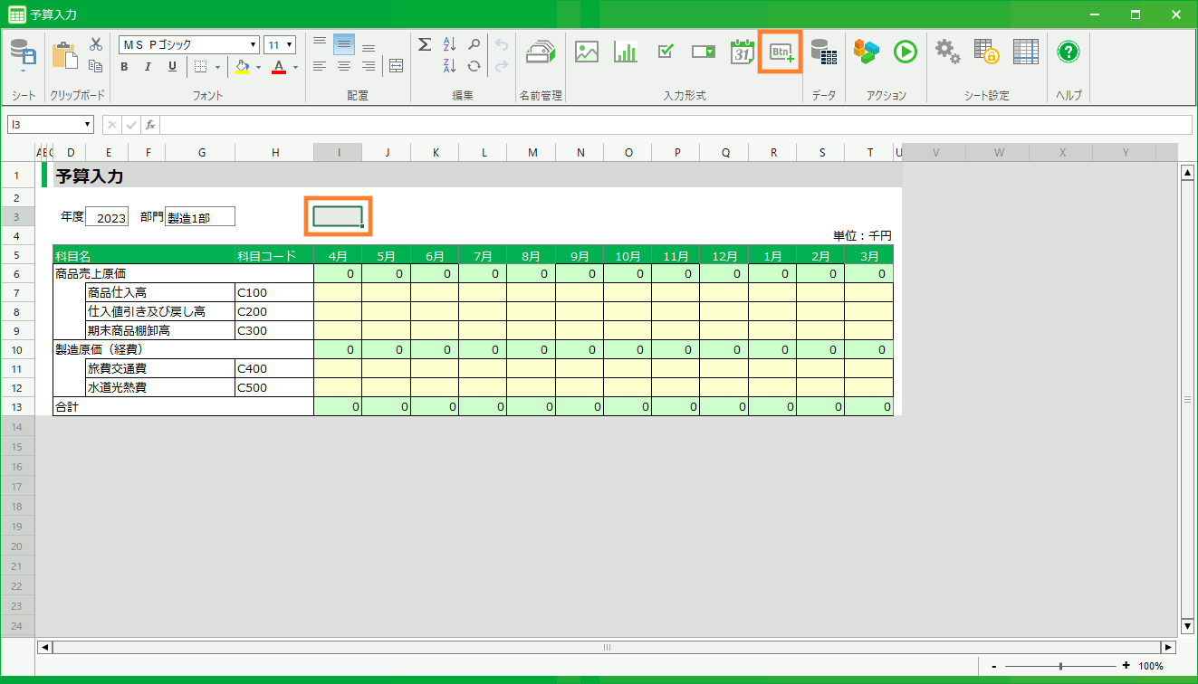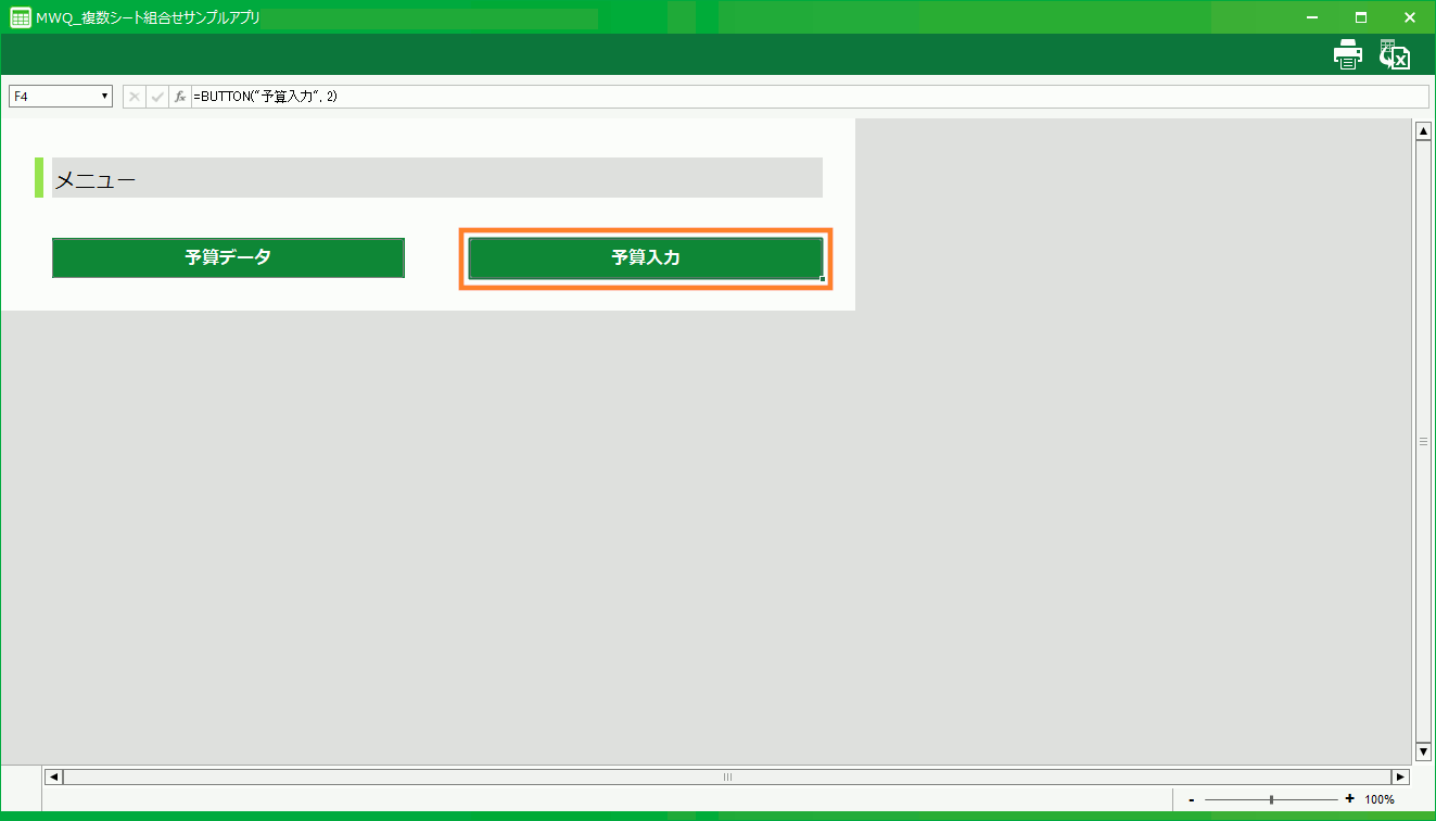 - 「[レイアウト用シート]」シートが表示されます。ボタンを配置したいセルを選択し、「ボタン作成」のアイコンをクリックします。
