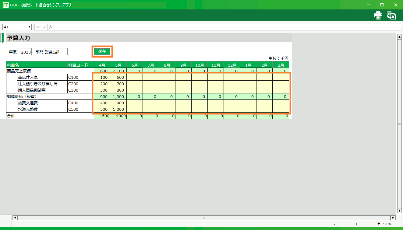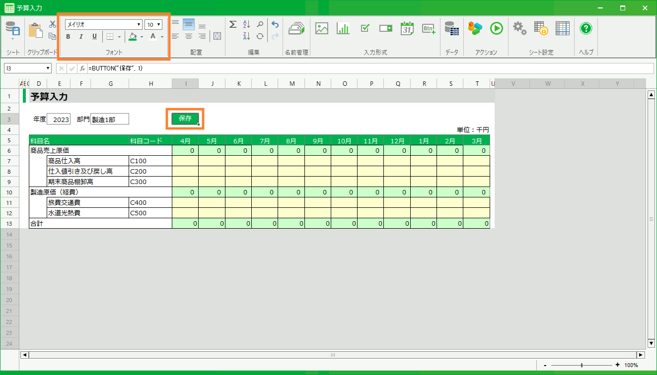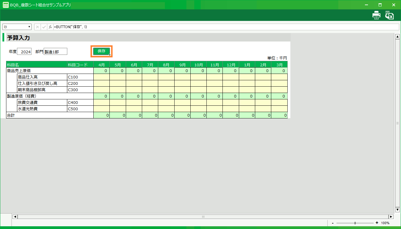 複数シート組合せアプリを使う前にレイアウト用シートに「保存」ボタンを設定します。