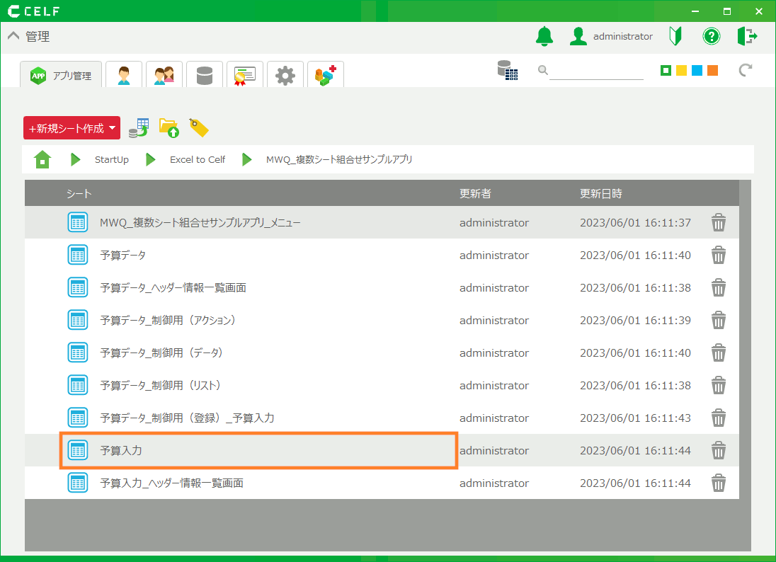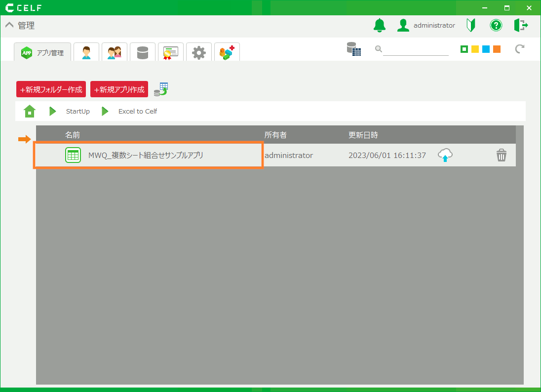 - 管理画面で「[複数シート組合せアプリ]」をダブルクリックします。