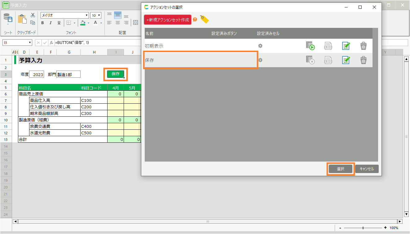 - 作成した「保存」ボタンをクリックします。「アクションセットの選択」画面が表示されます。「保存」をクリックして「選択」ボタンをクリックします。