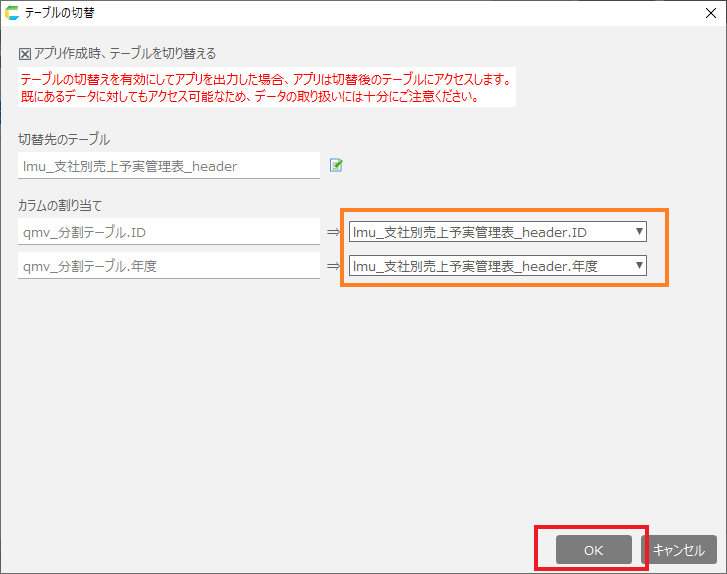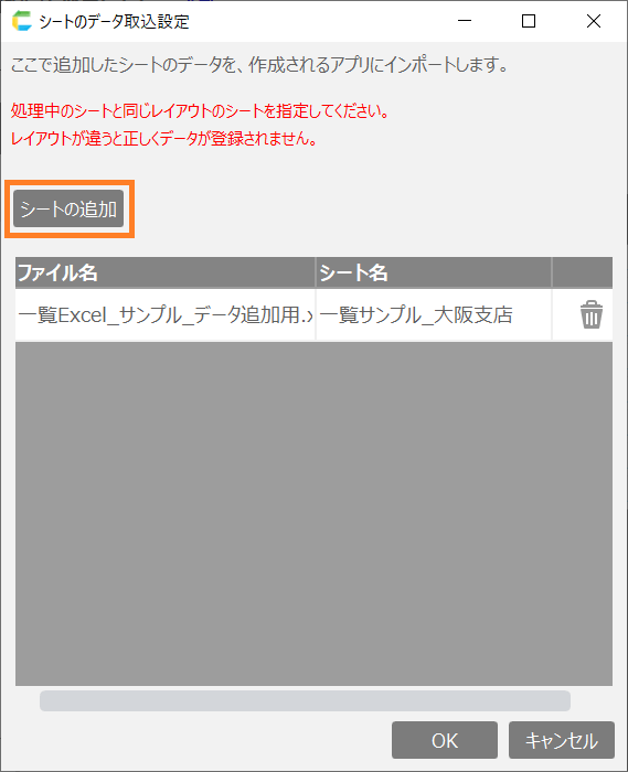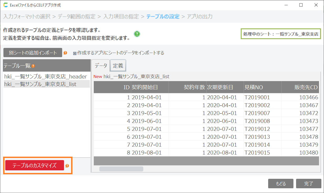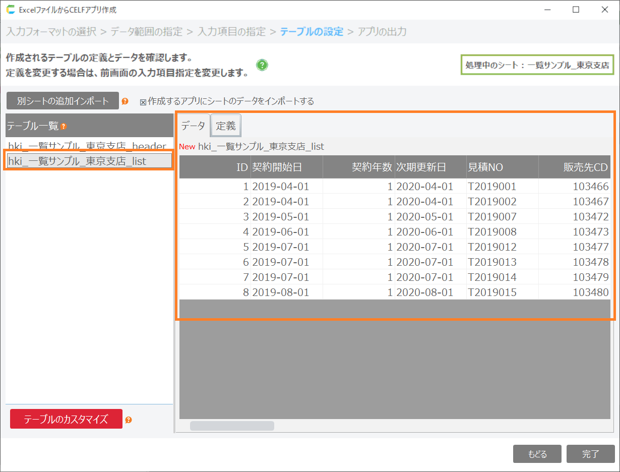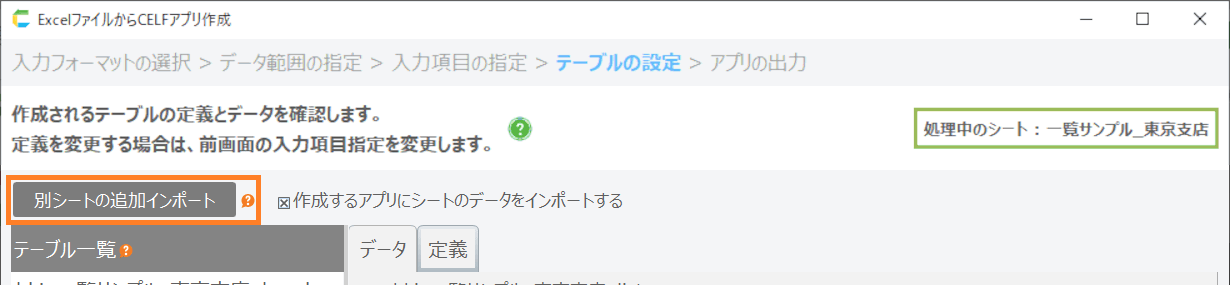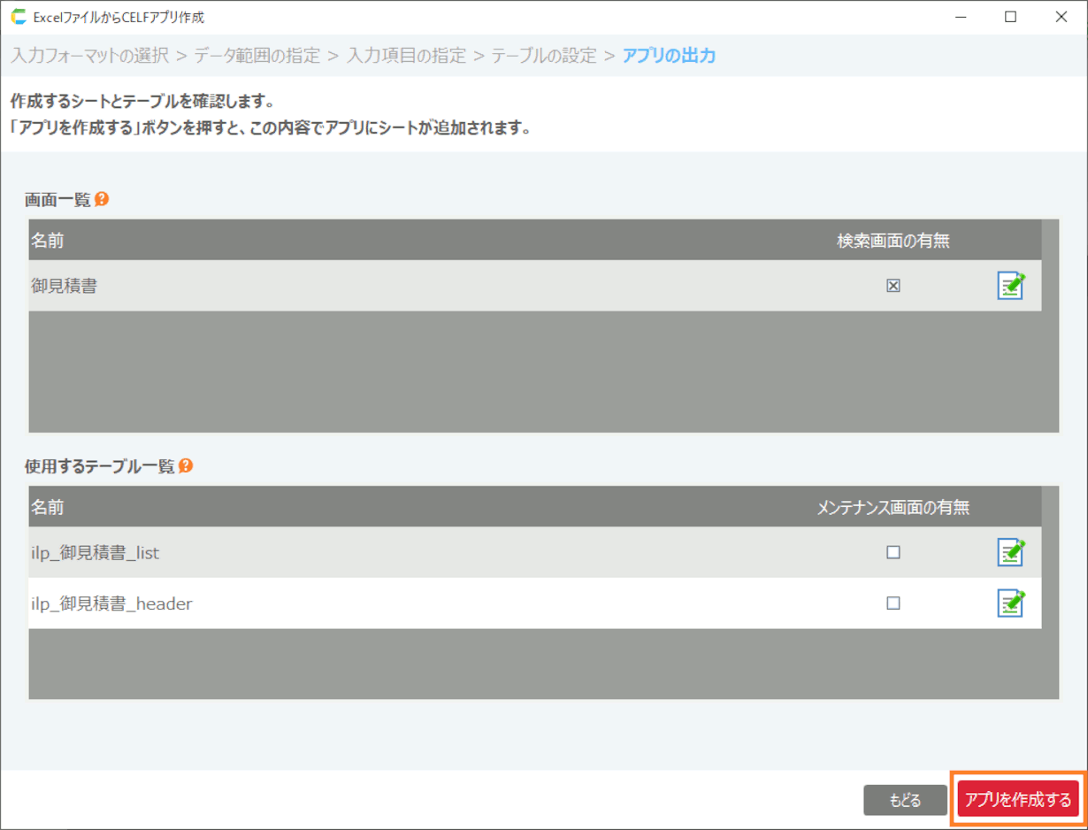 「作成するアプリにシートのデータをインポートする」にチェックすると読み込んだシートのデータを登録してアプリを作成します。チェックボックスを外すとテーブルのみ作成して、初期データのない状態でアプリが作成されます。![]()