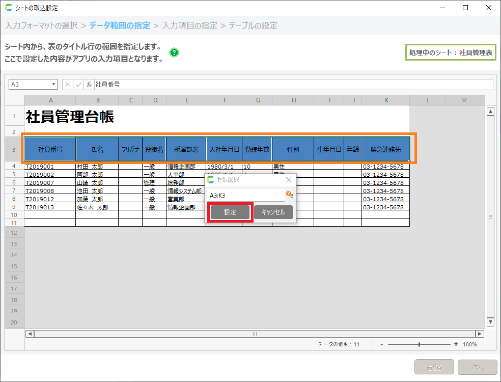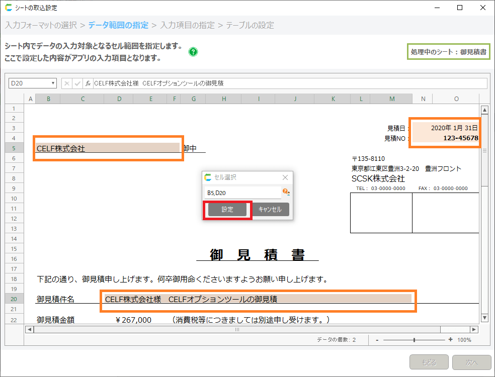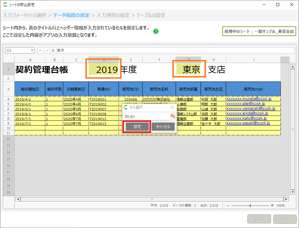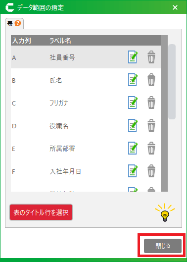 - 選択したデータ範囲が登録されます。問題がなければ、このダイアログを閉じて、次の画面に進みます。