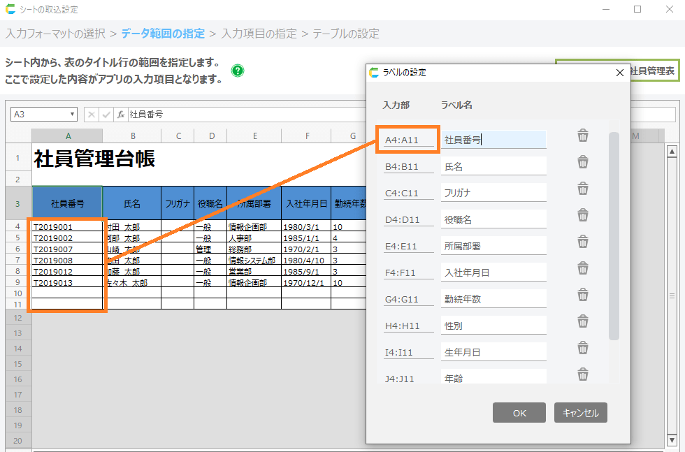 ここでは「Excelファイルからアプリ作成」機能のデータ範囲の指定方法について、細かい操作を説明します。