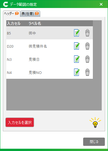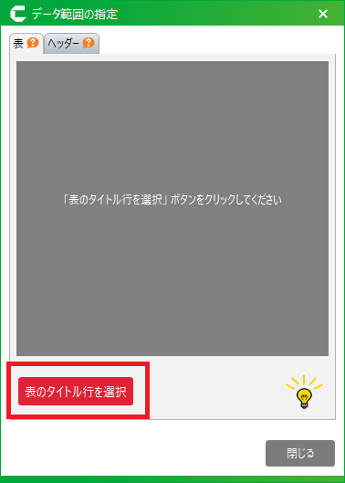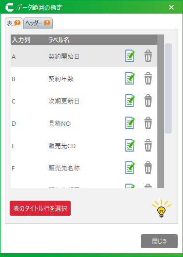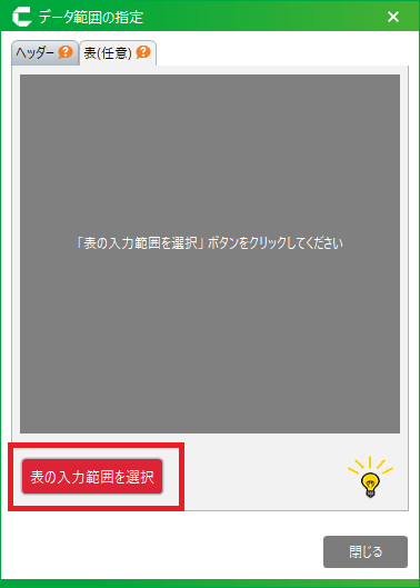 - 選択したデータ範囲が登録されます。「表」と「ヘッダー」の設定が完了したら、このダイアログを閉じて、次の画面に進みます。