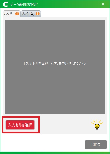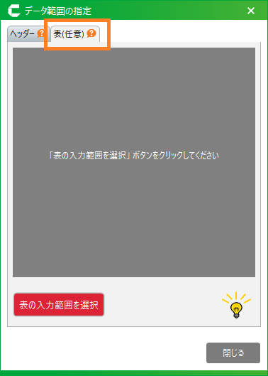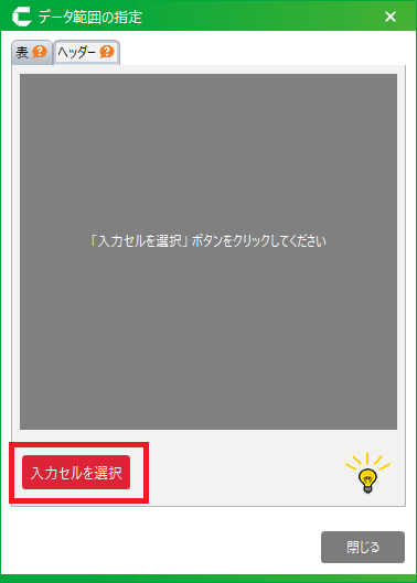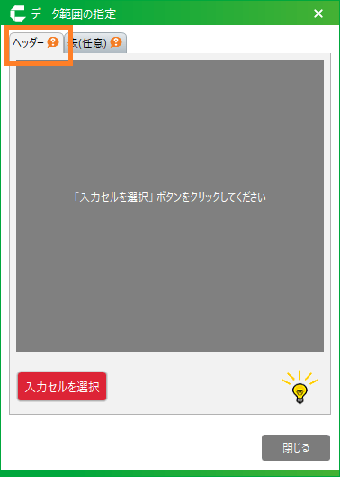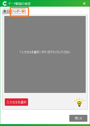 単票を選択した場合、データ範囲の指定ダイアログに「ヘッダー」タブと「表」タブが表示されます。