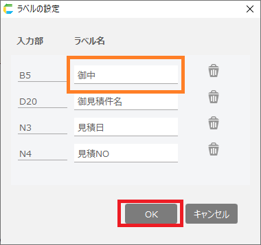 - ラベルの設定ダイアログが開きます。ラベル名を確認し、問題がなければ、「OK」ボタンをクリックします。