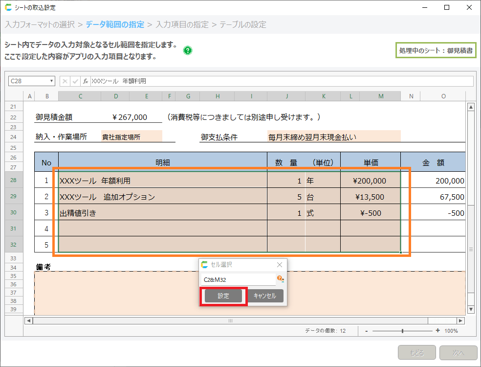 - データの入力セルを選択し、「設定」ボタンをクリックします。