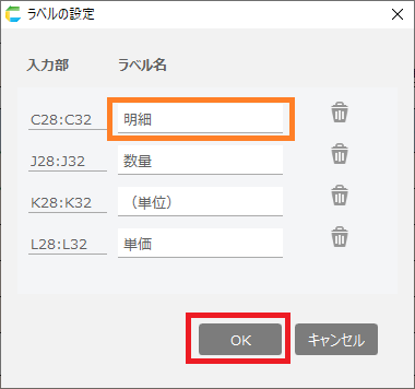 - ラベルの設定ダイアログが開きます。内容に問題がなければ、「OK」ボタンをクリックします。