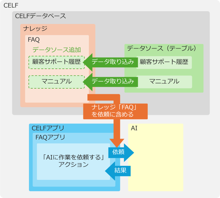 あらかじめデータをナレッジに取り込んでおくことで、生成AIアクションは依頼処理に関連するデータを自動的に検索して回答を作成します。