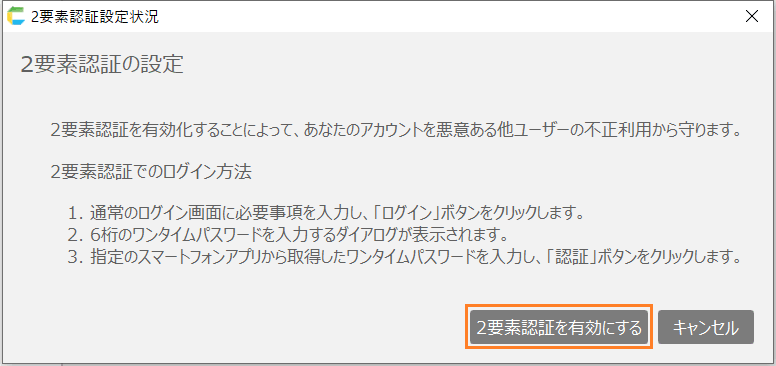- 「2要素認証設定状況」ダイアログにて、「2要素認証を有効にする」ボタンをクリックします。