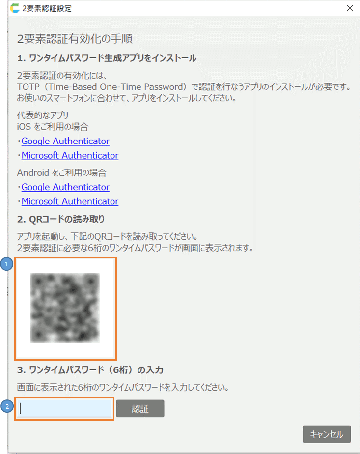 - 「2要素認証設定」ダイアログにて、QRコードが表示されます。お使いのスマートフォンのワンタイムパスワード生成アプリでQRコードを読み取り、アカウントを登録します。生成されたワンタイムパスワードを入力し、「認証」ボタンをクリックします。