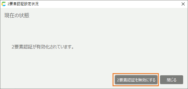 - 「2要素認証設定状況」ダイアログにて、「2要素認証を無効にする」ボタンをクリックします。