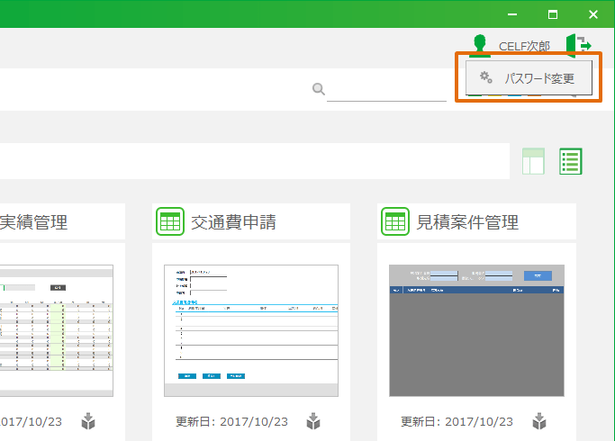 - 画面右上の「ユーザー」ボタンをクリックし、「パスワード変更」メニューを選択します。