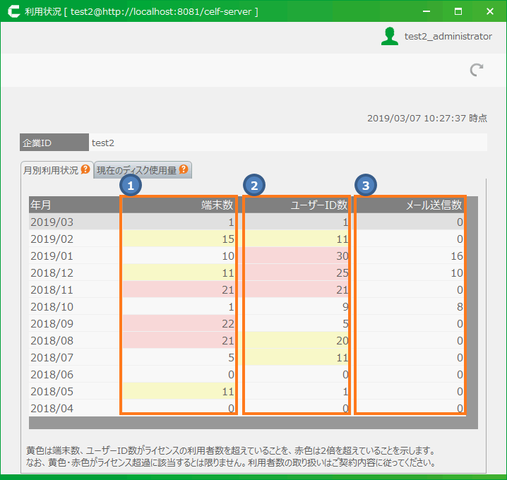 月別のログイン端末数、ログインユーザーID数、メール送信数、利用しているディスクの容量を確認できます。