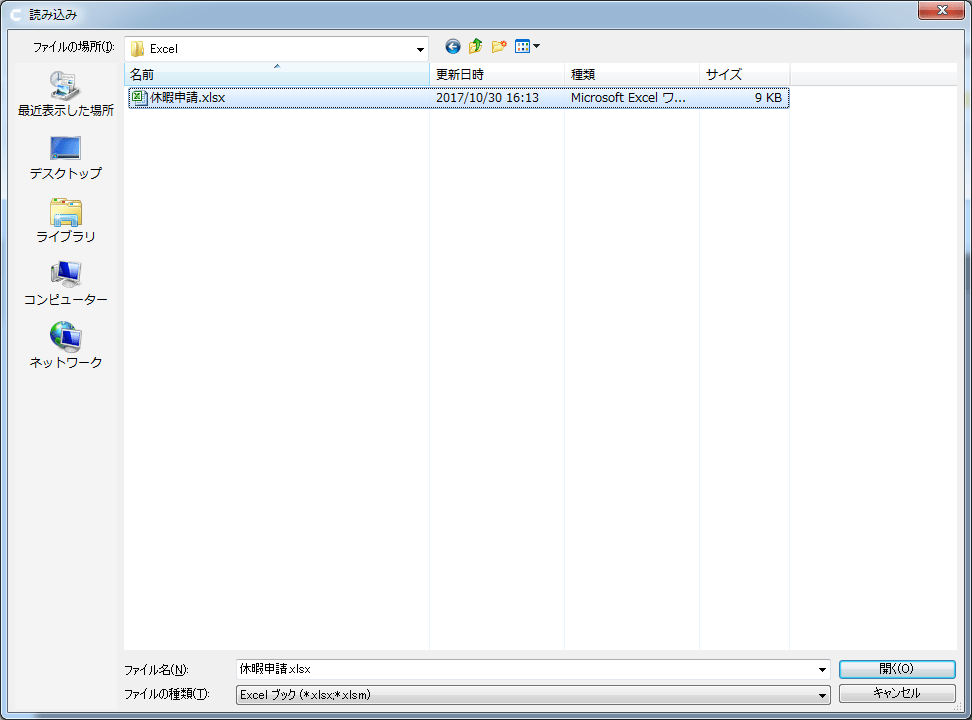 - インポートする Excel ファイル(.xlsx、または、.xlsm)を選択します。