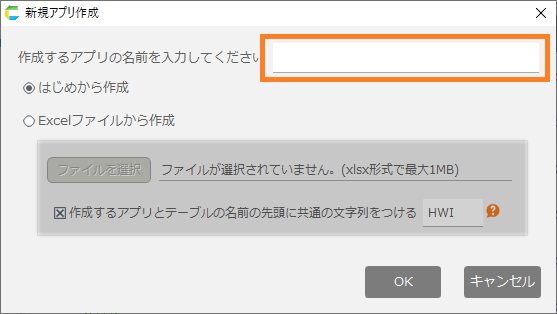 - 「新規アプリ作成」ダイアログが表示されたら、アプリの名前を入力します。