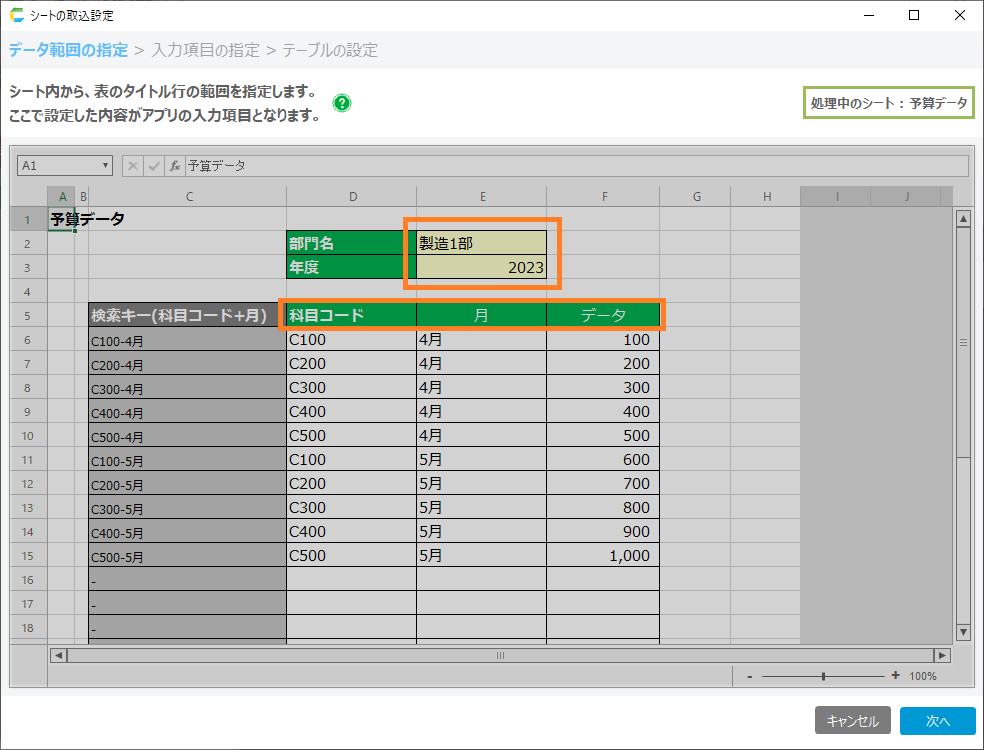 ヘッダー情報の連携は「データアクセスの設定」で設定したシートにヘッダー部がある場合に指定します。この指定はアプリ画面に表示する表のデータを検索するために使用します。