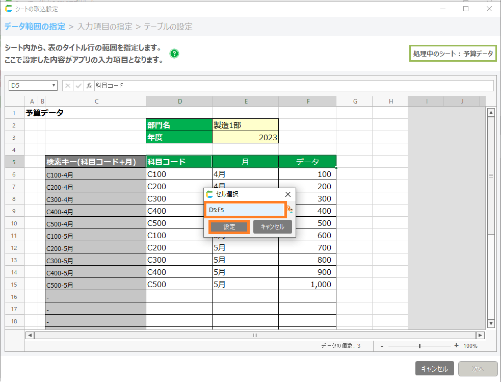 - 「表」のタイトル行を選択して「設定」をクリックします。サンプルでは「D5:F5」がタイトル行になります。