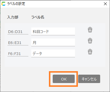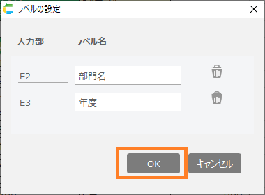 - 「ラベルの設定」ダイアログが開くので、「OKボタン」をクリックします。