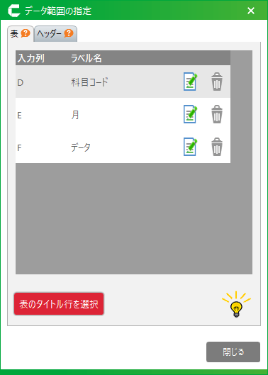 - 「データ範囲の指定」ダイアログの「表」タブから「表のタイトル行を選択」ボタンをクリックします。