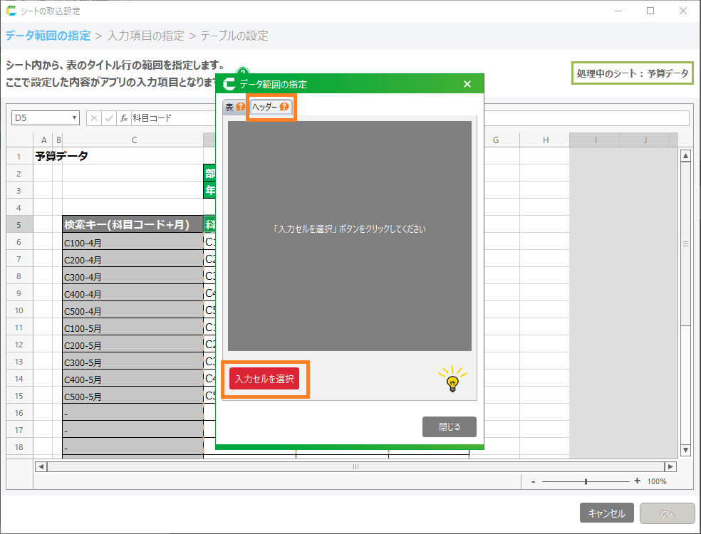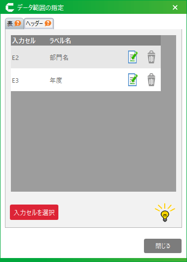 - 「データ範囲の指定」ダイアログのヘッダータブから「入力セルを選択」ボタンをクリックします。