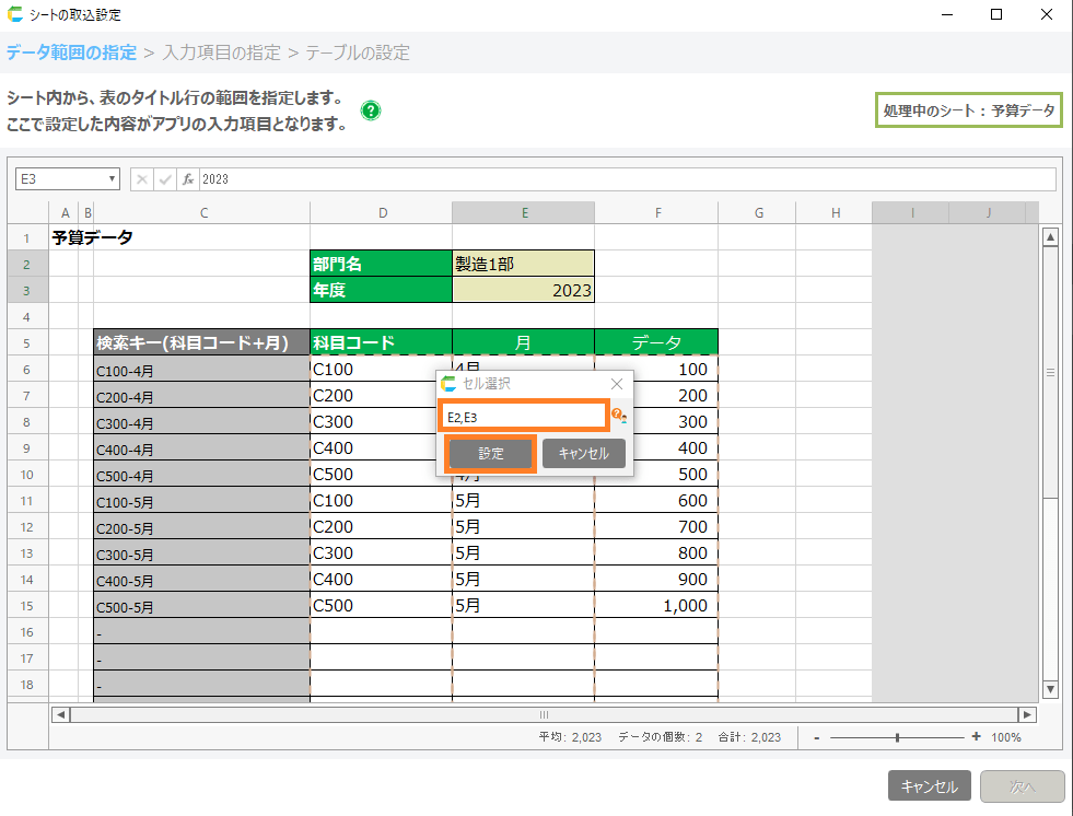 - 「ヘッダー」の入力セルを選択して「設定」をクリックします。サンプルでは「E2」、「E3」になります。