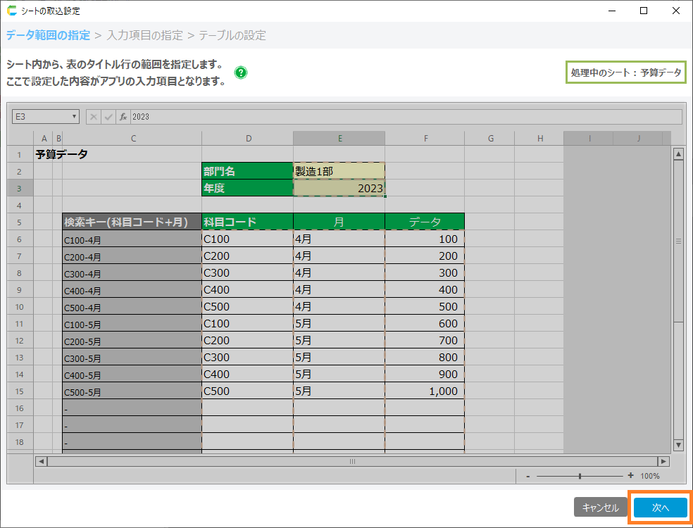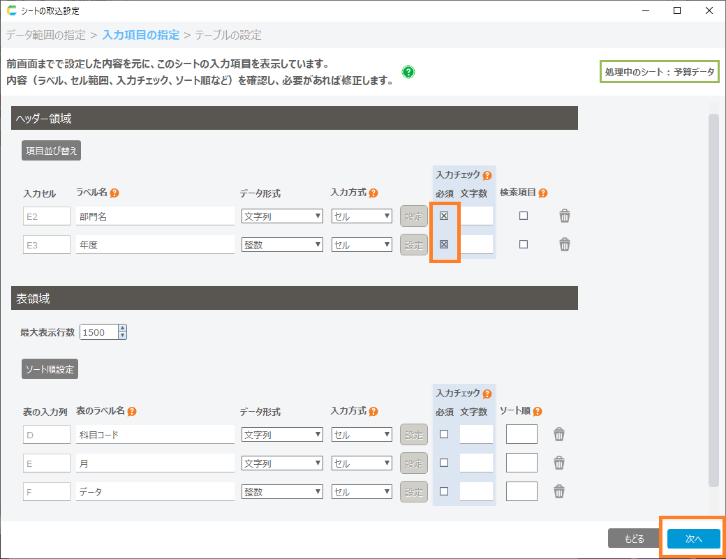 この画面では、前画面で設定した入力項目の詳細設定ができます。このサンプルではヘッダー領域の「部門名」、「年度」に必須チェックを入れ、「次へ」ボタンをクリックします。![]()