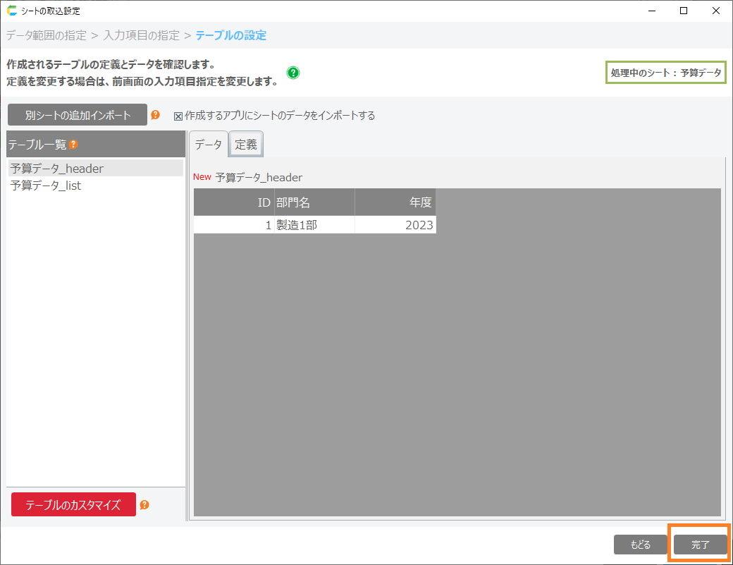 この画面では、自動で作成されるテーブルの詳細設定ができます。今回は何も変更せずに「完了」ボタンをクリックします。![]()