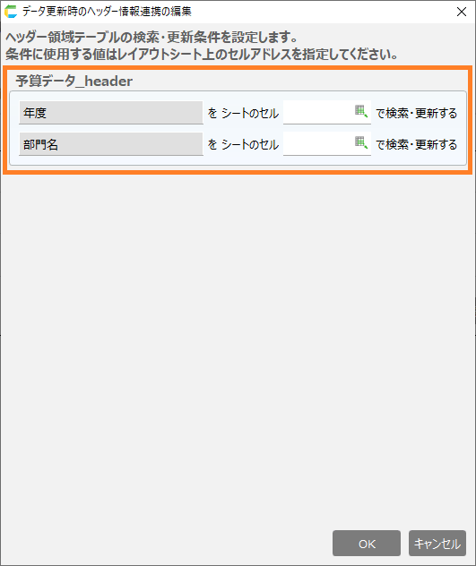 - 「ヘッダー情報の連携」の横のアイコンをクリックし、「データ更新時のヘッダー情報連携」のダイアログを開きます。
